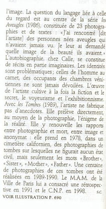OBSERVATIONS: Certes, les oeuvres sont d’une grande intensité, mais malheureusement, tombent vite dans le mal-sain, la perversité. Les trois premières salles se laissent voir sans grands soucis ; l’intimité de l’artiste, même qu’elle ne soit pas banale, ne choque pas outre mesures. (personnellement !) Je dirais même que ces images arrivent à être touchantes, quand l’artiste, par exemple, nous fait vivre l’évolution de la vie de Cookie, ou encore celle de ses deux amis homosexuels atteints du SIDA. Après ces clichés, justement touchants, on attend quelque chose de positif, mais elle nous donne simplement à voir des photographies de reliques. La salle suivante est trop théâtralisée, trop mise en scène, le scénario trop travaillé. Ensuite elle nous donne à voir du trash, supportable. C’est après que tout dérive. On se retrouve face à des oeuvres mêlant des enfants aux ébats amoureux de leurs parents. Là, on tombe dans le mal-sain, le pervers, et ce jusqu’à la fin de l’exposition.