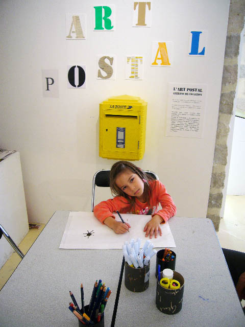 Lou dessine sur une enveloppe et va l’envoyer à Pierre Alechinsky. Dans l’exposition d’Art postal: Dominique Penloup Pastiches et mélanges à partir de Pierre Alechinsky, 15 juin au 28 septembre 2008 Orangerie des Musées de Sens. Blog de Dominique Penloup