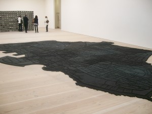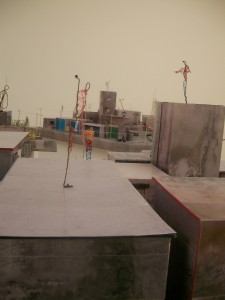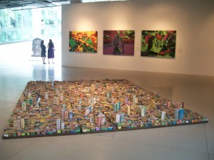 Bidonville miniature qui m’a rappelé l’immense morceau de caoutchouc à la Saatchi Gallery (exposition : UNVEILED:NEW ART FROM THE MIDDLE EAST du Jan 30th – May 9th 2009) de Marwan Rechmaoui, Beirut Caoutchouc ou aussi le travail de Wafa Hourani, Qalandia 2067 .