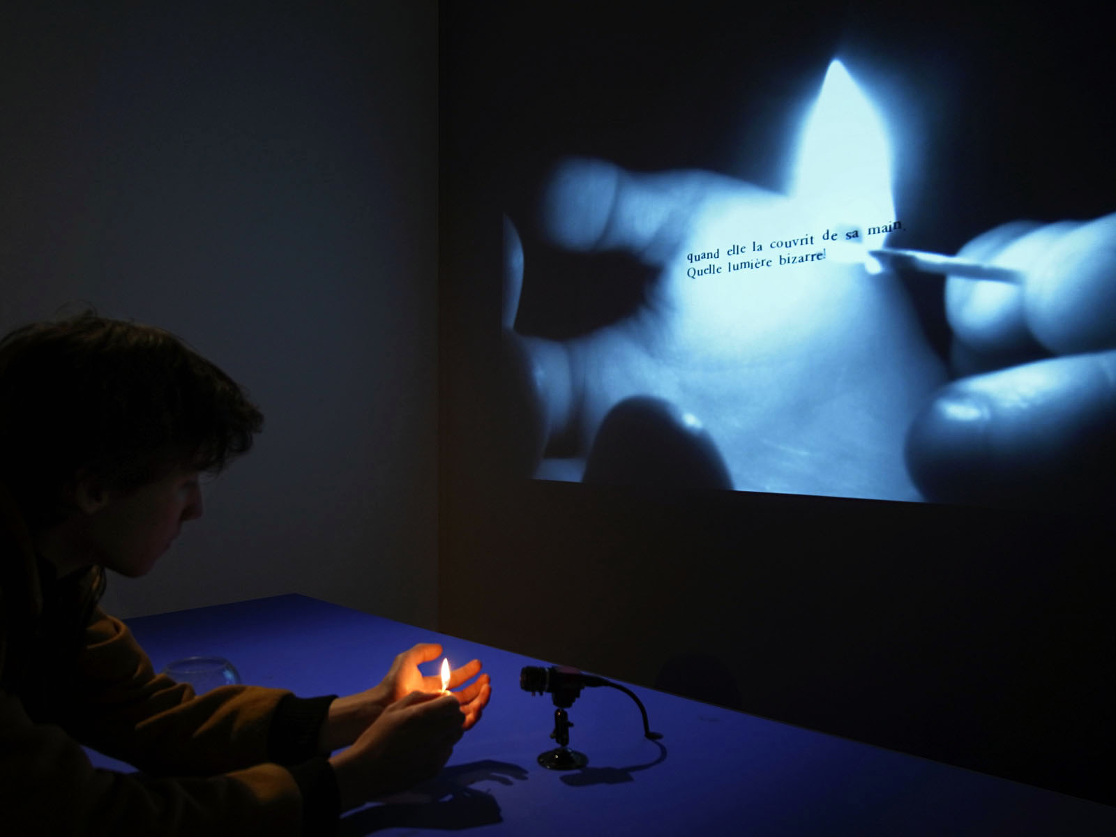 Abbaye de Saint-Riquier, Centre culturel de rencontre, exposition « leurs lumières » (du 13 octobre au 16 décembre 2012). La Petite Fille aux allumettes, installation interactive de Mayumi Okura, 2007-2012. En craquant une allumette, on provoque la projection et on voit se former les phrases dans la lumière.