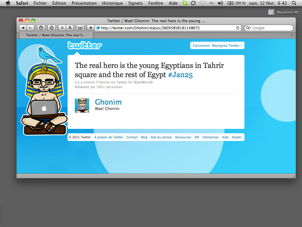 Ainsi, les pages Facebook de Gigi Ibrahim (l’une des « stars de Twitter » issues des journées du Caire) : http://www.facebook.com/people/Gigi-Ibrahim/620423960. Et son Twitter : https://twitter.com/#!/Gsquare86
