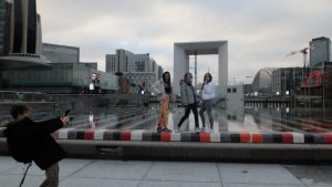Jade est filmée depuis l’Arche de la Défense avec les grattes-ciels derrière, ce qui donne une impression d’irréalité.