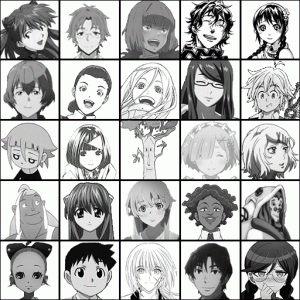 Je vais dans cette partie-ci raconter quelques détails liés à la réalisation du Geek Art. Après avoir choisi les différentes images qui composeront le Geek Art j’ai dû uniformiser les fonds de celles-ci, c’est-à-dire rendre les fonds de toutes les images blanc. J’ai également rencontré quelques problèmes avec quelques images issues de manga car parfois les cases coupent la tête des personnages. J’ai donc dû, pour quelques personnages, dessiner le reste des éléments coupés via Photoshop. J’ai également eu à le faire pour les images d’animes où les têtes étaient coupées, je devais donc prolonger l’image tout en faisant attention à ne pas la « dénaturer » (respecter les couleurs, la continuité des formes, etc…). J’ai également pour certain personnage modifier quelques traits du visage (notamment la bouche) afin d’accentuer le côté sympathique pour la phase 1 et le côté violent pour la phase 2, sans cependant dénaturer l’image où changer totalement la mentalité des personnages.