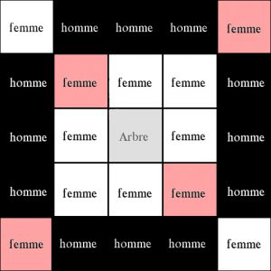 Puis j’ai ensuite remarqué qu’il y avait deux paires de personnages qui avaient les caractéristiques suivantes : personnages de même univers + de même sexe. J’ai donc encore décidé de placer ces personnages de même sexe et univers symétriquement l’un à l’autre par rapport à la case du centre. J’obtiens donc la forme finale suivante (après avoir choisi où placer ces paires) :