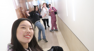 Nous avons choisi de nous balader dans le centre commercial de Vélizy 2. J’étais déguisé en gothique avec des oreilles et une queue de chat. Abygaël était habillée en scientifique folle. Véronique portait un kimono traditionnel. Enfin Samy portait un kigurumi représentant le chat de Cheshire.